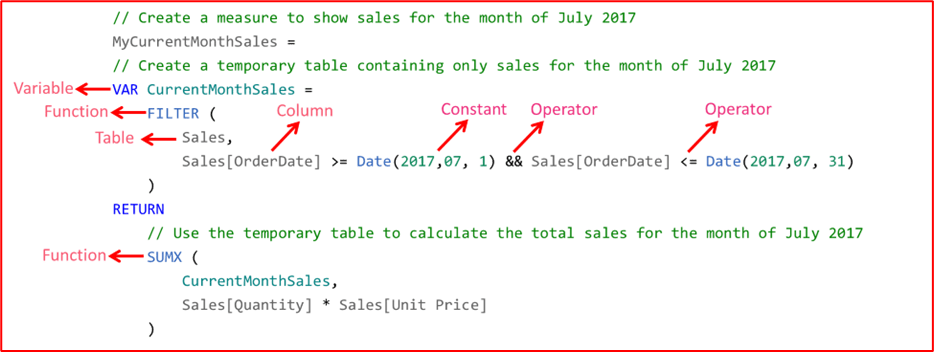 The example code below shows how a DAX formula is assembled.